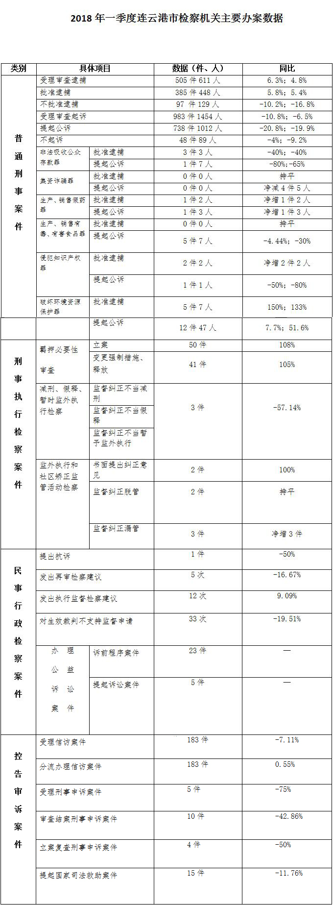 2018年一季度连云港市检察机关主要办案数据