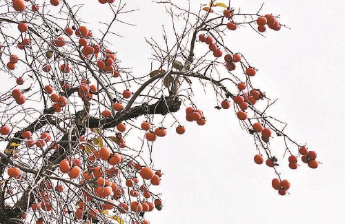 渐渐地,吃柿子的鸟儿多起来了。我喜欢让麻雀来吃,它们个头小吃得少,每次啄几口就够了。最怕喜鹊和乌鸫,它们个头大,一颗柿子都填不饱肚子,一会儿就能把一颗熟柿子啄掉大半,而且一来就是七八只,没一会儿工夫,枝丫上就会空好几处。经观察发现,绝大多数柿子不是自然掉落,而是被鸟儿吃完的。我心里有些着急,倒不是舍不得柿子,是怕鸟儿吃得太快,缩短了柿子挂在枝头的日子。有时我会望着满树橙红,心想要是能和这些鸟儿商量商量就好了,让它们慢些吃,有计划地吃,让柿子能留到下雪的时候——到时候白雪覆盖着整棵树,压在枝丫上,压在熟透的柿子上,抬头看到的是嵌在雪下面的一个个橙红,那该是多好的景致呀。