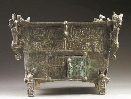 刖人守门鼎,出土于宝鸡茹家庄鱼国墓地,现藏于宝鸡青铜器博物院。该鼎整体呈长方形造型,分为上下两层,上层用来盛放食物,下层用来盛放炭火。鼎的四周装饰了很多动物纹饰,最引人注目的是右边的门口,站有一位束发、受刖刑失去左脚的奴隶。古人以这种形式教化平民和奴隶要遵纪守法。这是研究西周社会制度和刑法制度的实物资料。